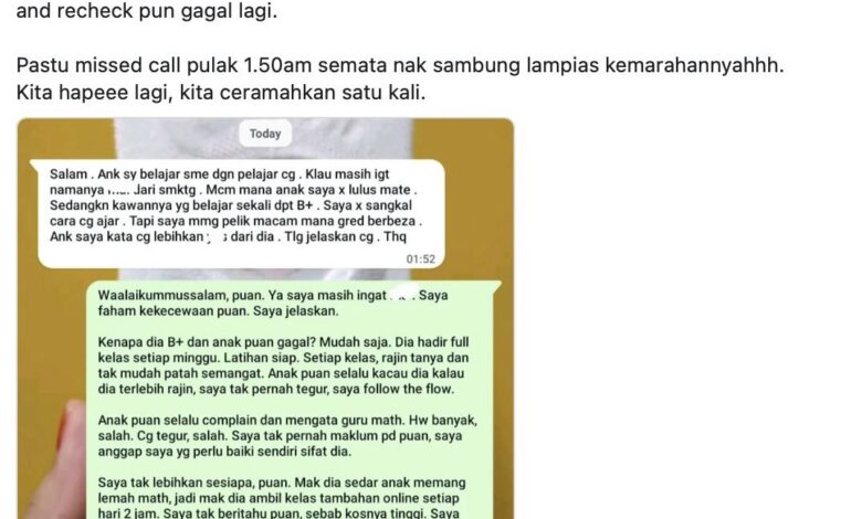 Menerusi hantaran di Threads, guru tersebut mendakwa ibu bapa itu menjadi emosional selepas keputusan diumumkan dan menuduhnya bersikap ‘berat sebelah’, sambil membandingkan anaknya dengan pelajar lain yang memperoleh gred B+.