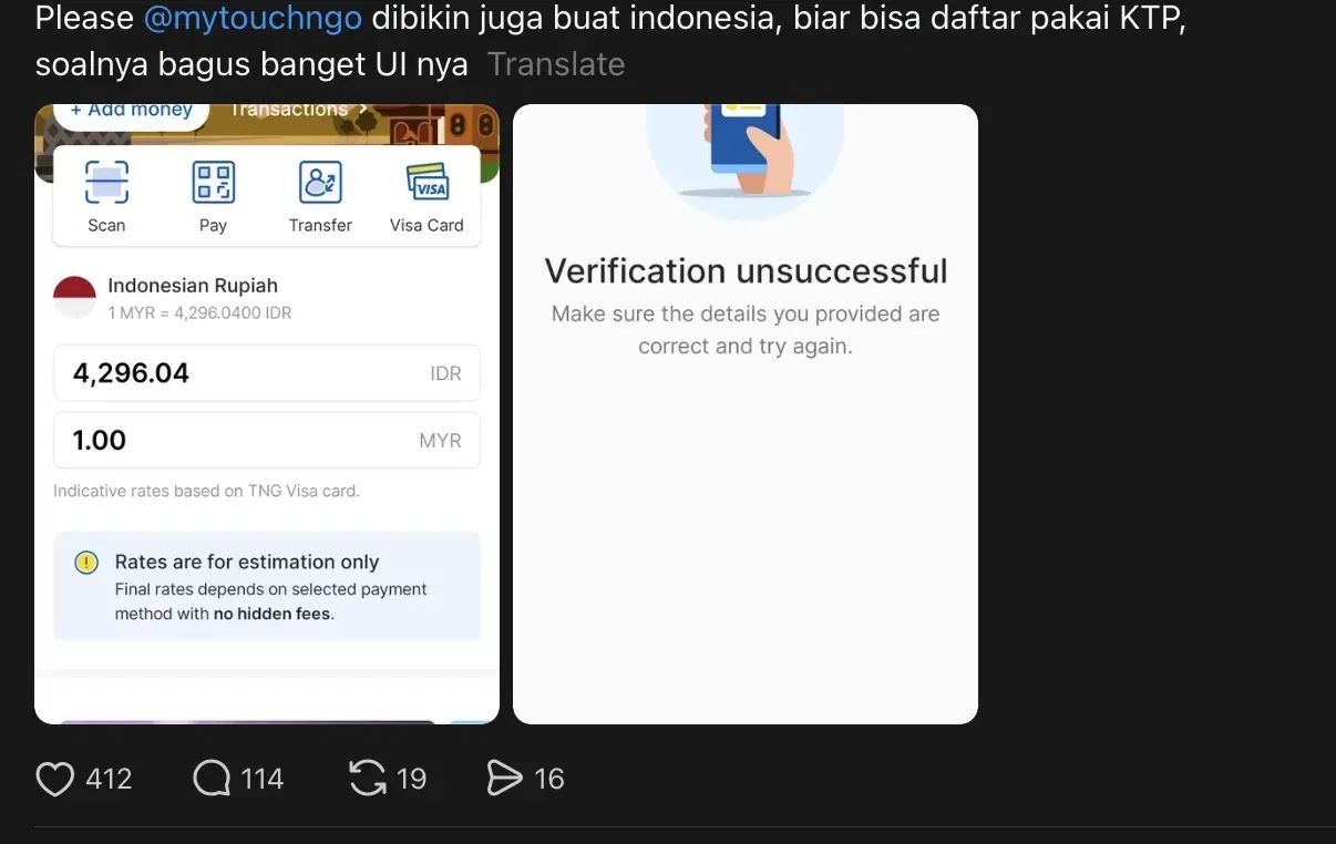 “Tolong @mytouchngo, buat satu untuk Indonesia juga supaya kami boleh daftar guna KTP. UI dia sangat bagus dan menarik,” tulis pengguna itu.
